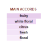 Hương trái cây tươi mát với hương cam bergamot, và đào Bellini chín mọng. Đan xen bằng những bông mẫu đơn, hoa lài thơm ngát và gỗ đàn hương quyện xạ hương rất mềm mại. Tựa như chiếc khăn voan mỏng mượt mà khoác lên người bờ vai mong manh làm tăng thêm vẻ yêu kiều nữ tính của người con gái