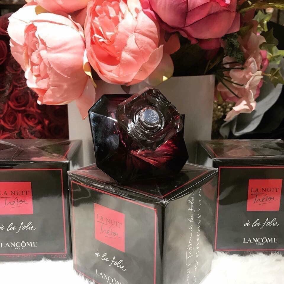 Nước hoa Lancome La Nuit Trésor À La Folie EDP dành cho phụ nữ thể hiện khoảnh khắc thăng hoa và duy nhất khi tình yêu đích thực ở đỉnh cao của nó. Những người yêu nhau đắm chìm trong cảm giác vượt quá bản thân và trải nghiệm cảm giác hồi hộp của tình yêu. một cảm giác không thể diễn tả khiến bạn quên đi mọi thứ và mất kiểm soát. Áp đảo và cực kỳ gợi cảm, sự hồi hộp nóng bỏng của tình yêu được thể hiện hoàn hảo bởi hoa hồng bốc lửa, rất gợi cảm và gây nghiện, cộng thêm sự hòa hợp với các loại thảo dược và Vanilla ngọt ngào càng làm tăng thêm sức hút cho hương thơm.