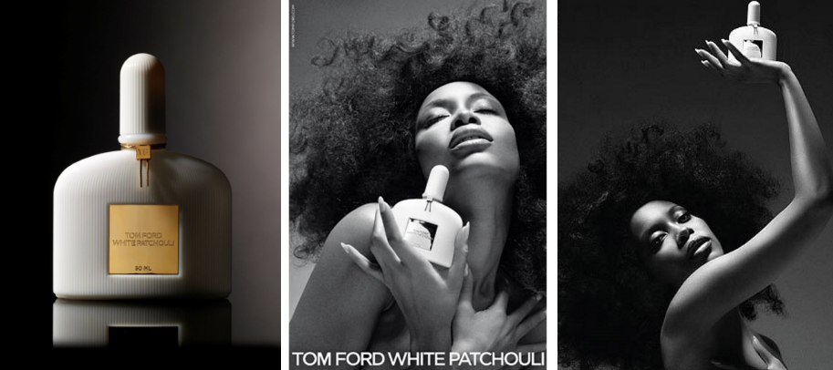 Tom Ford White Patchouli thiết kế mẫu chai với tông màu chủ đạo là màu trắng thanh khiết và tinh khôi. Kết hợp với mẫu chai cổ điển và khung chính giữa vuông vắn với sắc vàng thỏi sáng bóng toát lên vẻ thanh tao và sang trọng. Những hình ảnh quảng cáo cho Tom Ford White Patchouli được lấy cảm hứng từ hai màu sắc đối nghịch: đen – trắng nhưng sống động và vô cùng nổi bật. Nhiếp ảnh gia phụ trách hình ảnh là Mert Alas và Marcus Piggott, gương mặt đại diện là ca sĩ da màu nổi tiếng Erykah Badu với mái tóc xù bồng bềnh đánh rối cùng với các bức ảnh rất đẹp, ấn tượng và kiêu sa